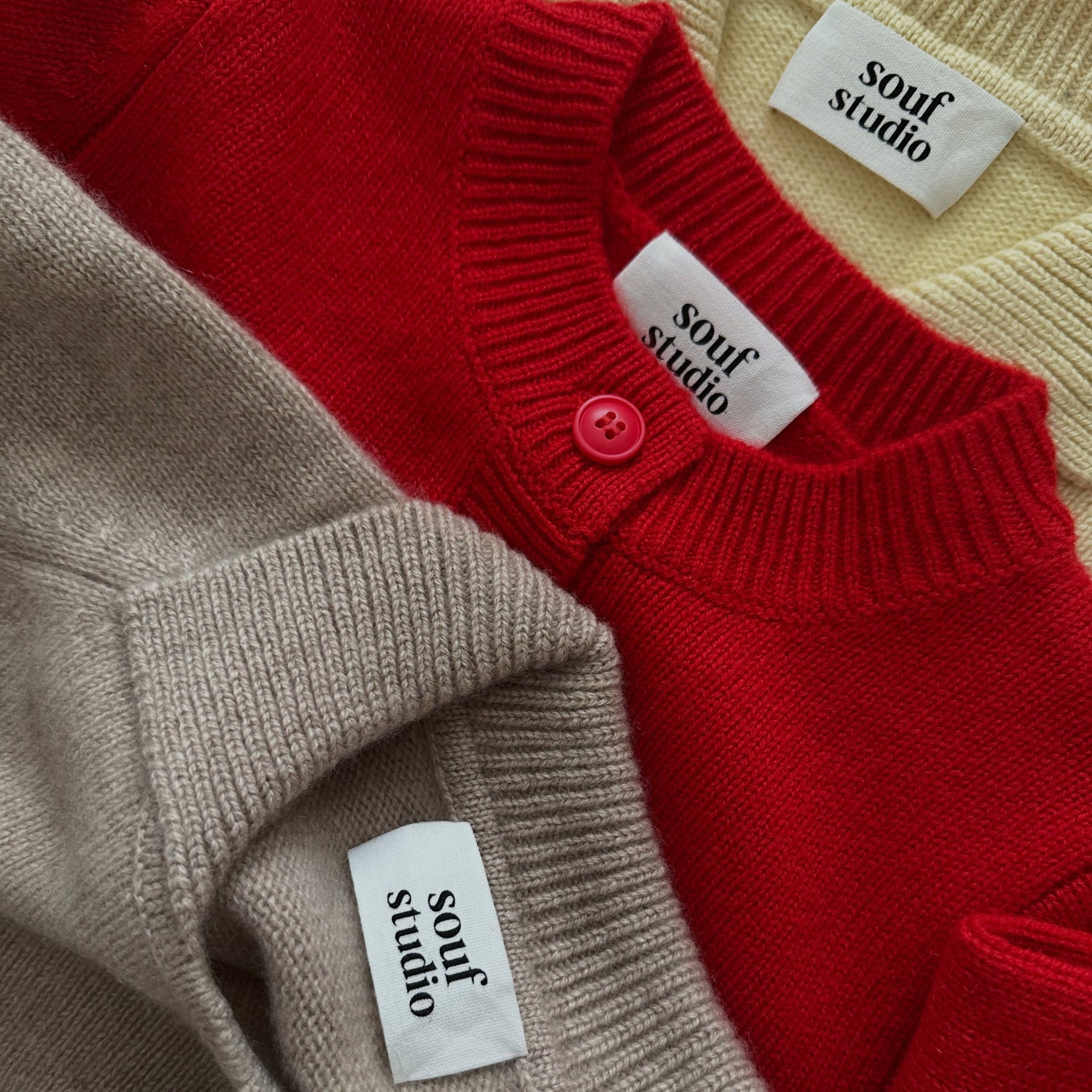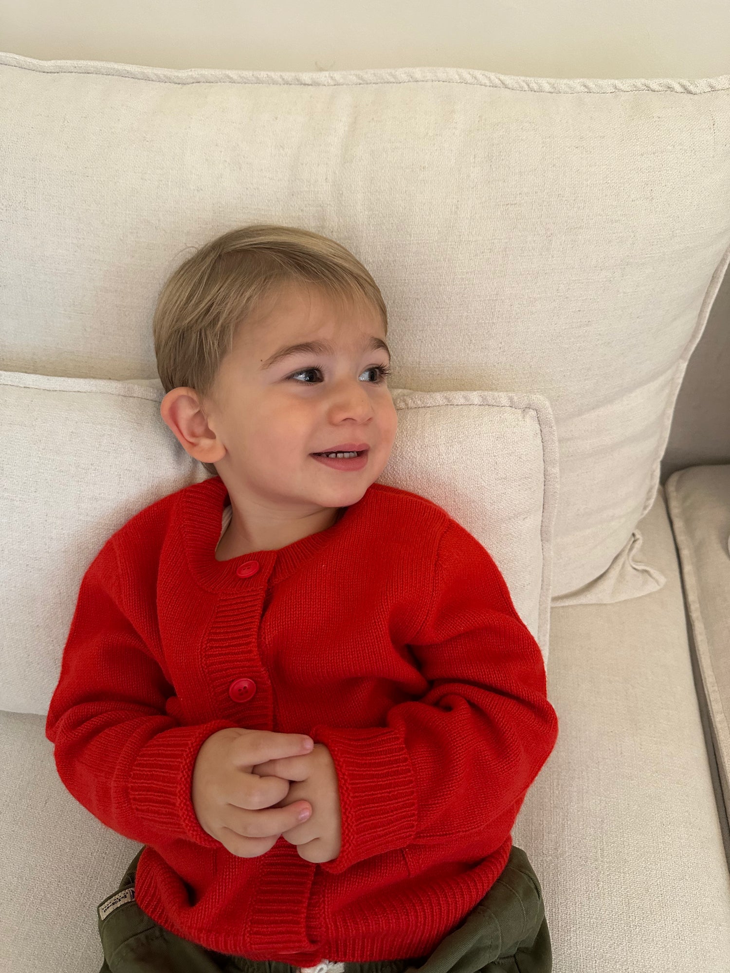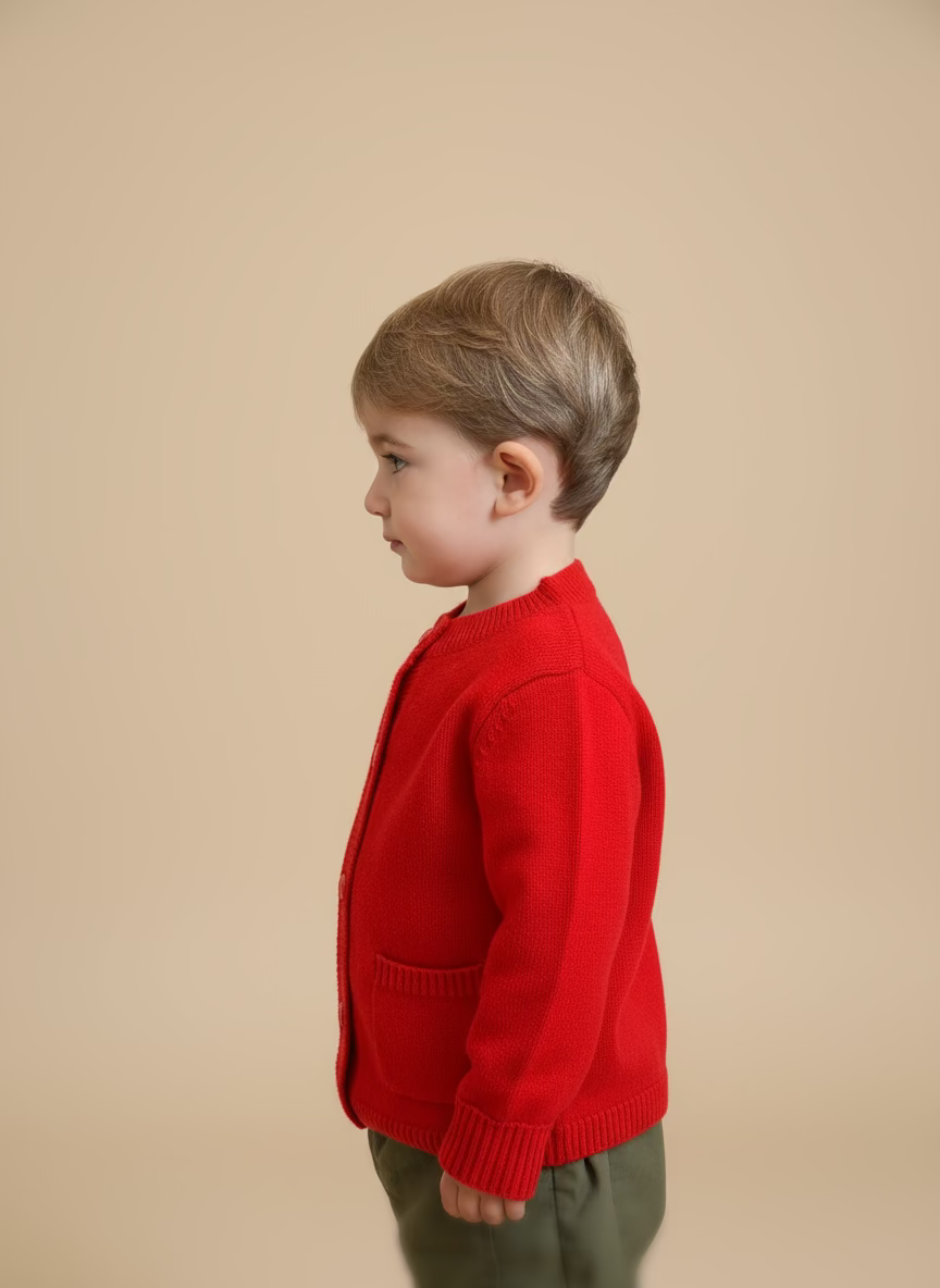 Vores røde cardigan i 100% cashmere kan bruges alene eller styles sammen med vores polosæt for et komplet look. Blød, varm og tidløs – perfekt til hverdag og særlige øjeblikke.